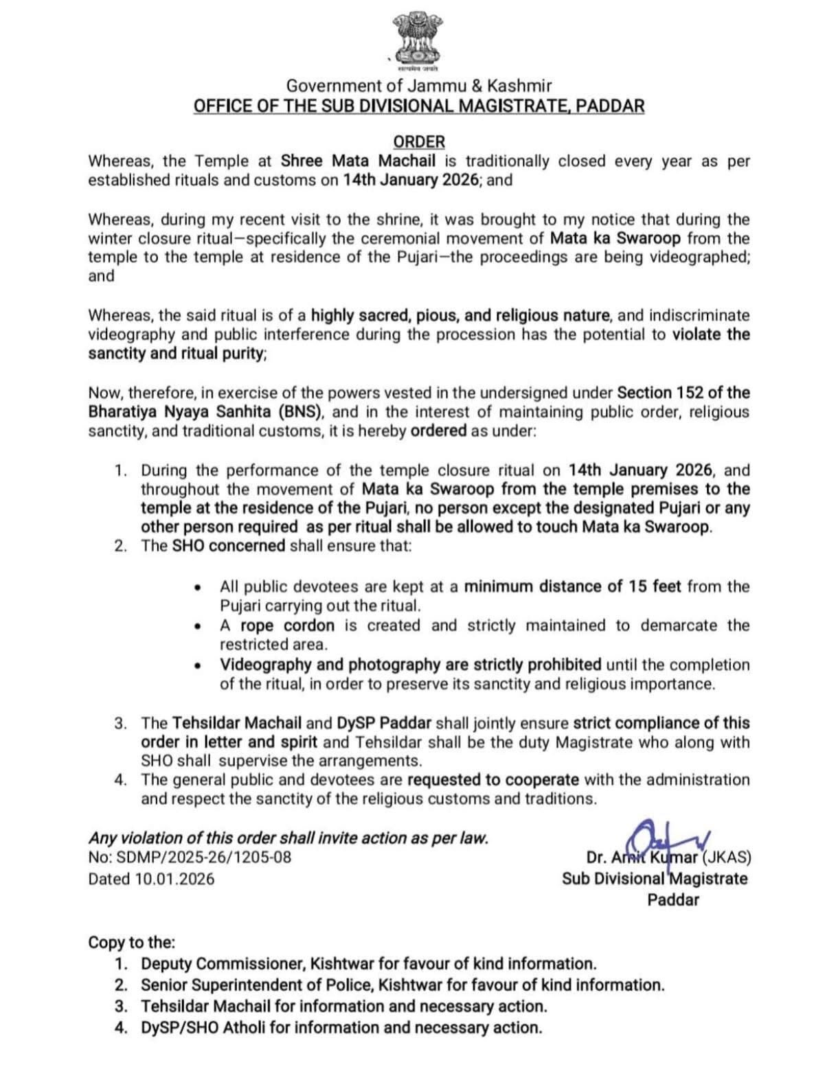 Exercising powers under Section 152 of the Bharatiya Nyaya Sanhita (BNS), the SDM Paddar has strictly prohibited videography and photography during the ritual until its completion. The order also specifies that only the designated Pujari or persons required as per ritual traditions shall be permitted to touch Mata ka Swaroop during the ceremony.