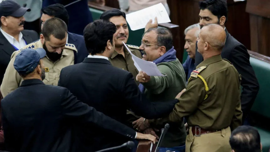 Jammu, Feb 18: Tensions flared in the J&K Legislative Assembly for around half an hour on Tuesday as Congress and National Conference MLAs, joined by independents, protested against BJP MLA Vikram Randhawa over his alleged remark dubbing “Kashmiri Muslims as landgrabbers.”