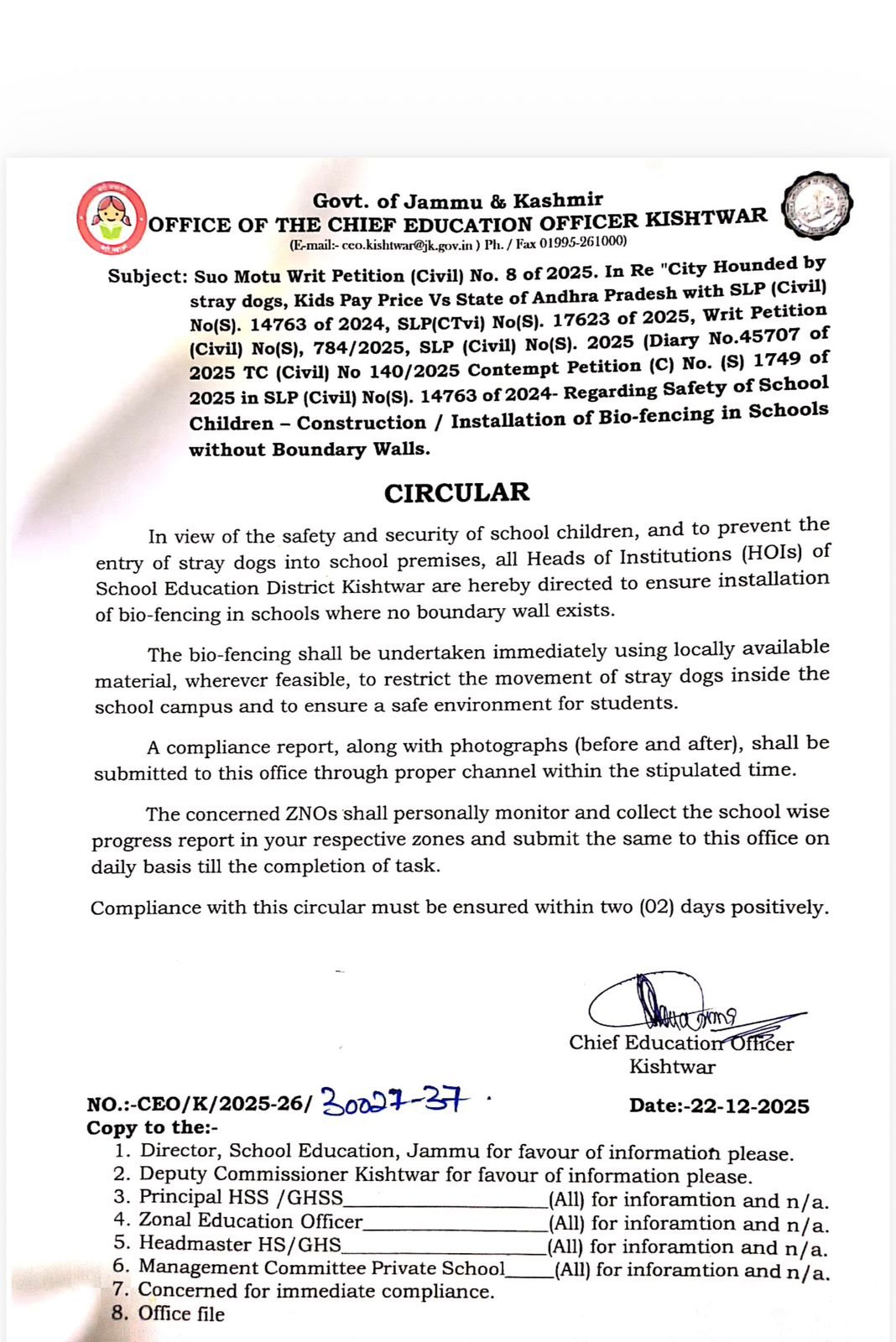 Even as the Chief Education Officer (CEO) Kishtwar has directed immediate bio-fencing of school premises to prevent the entry of stray dogs, the directive has raised practical concerns on the ground, particularly regarding availability of funds, as most schools in Jammu and Kashmir are currently closed due to winter vacations.