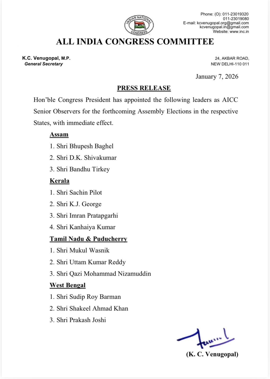 New Delhi, January 7, 2026: The All India Congress Committee has put in place a detailed plan by appointing senior national leaders as AICC Senior Observers for the upcoming Assembly elections in Assam, Kerala, Tamil Nadu and Puducherry, and West Bengal. The move is aimed at ensuring strong organisational supervision, effective coordination with state units, and timely feedback to the central leadership. The Senior Observers will closely monitor election preparedness, strengthen the party structure at all levels, guide campaign planning, address organisational issues, and help translate the party’s political messaging into effective ground-level outreach.