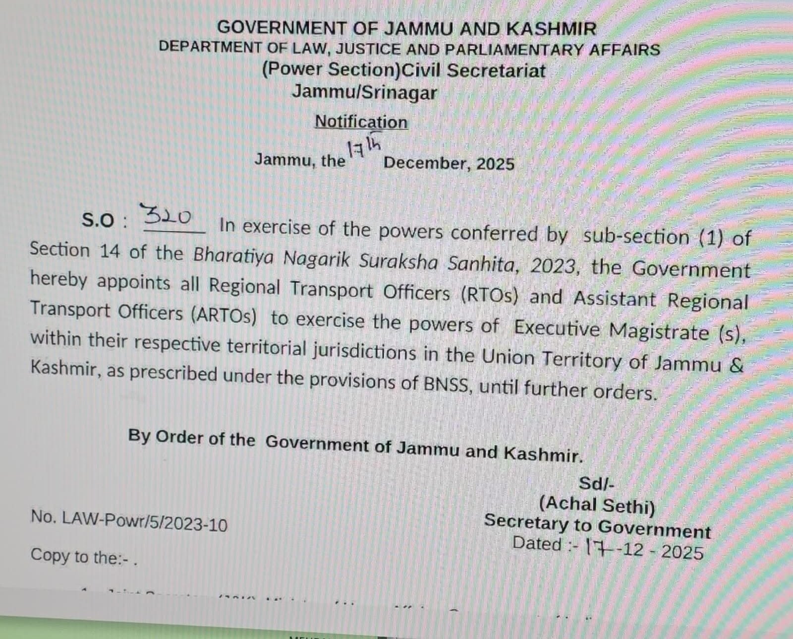According to a notification issued by the Department of Law, Justice and Parliamentary Affairs (Power Section), Govt of Jammu and Kashmir under S.O. 320, the government, in exercise of powers conferred under Section 14(1) of the Bharatiya Nagarik Suraksha Sanhita (BNSS), 2023, has authorized RTOs and ARTOs to exercise the powers of Executive Magistrates within their respective territorial jurisdictions in the Union Territory of Jammu and Kashmir, until further orders.