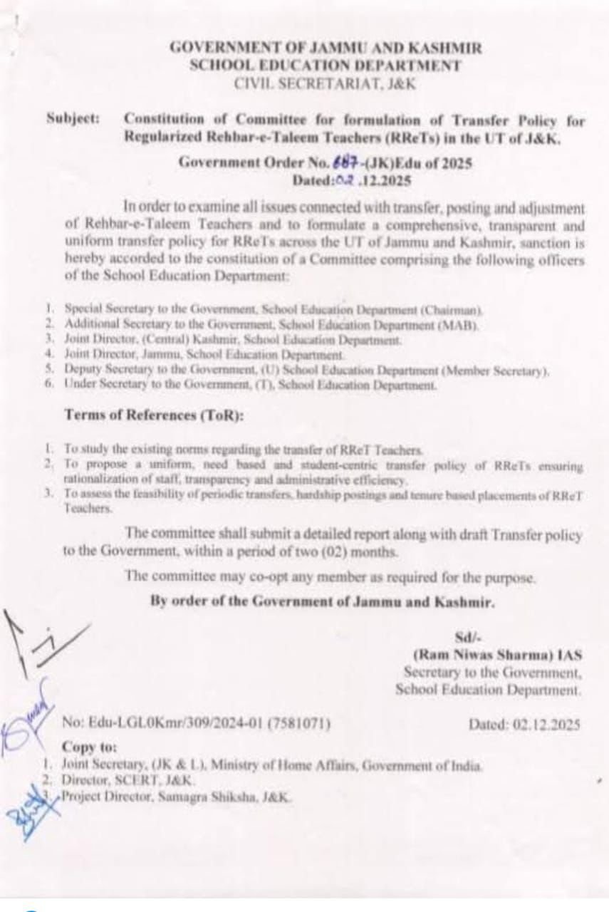 The Government of Jammu and Kashmir has constituted a high-level committee to formulate a comprehensive, transparent, and uniform transfer policy for Regularized Rehbar-e-Taleem Teachers (RReTs) across the Union Territory.