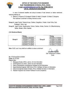 Doda, October 6, 2025: The Executive Engineer, Sub Transmission Division, JPDCL Doda, has issued a fresh circular announcing a new rotational power curtailment schedule following inclement weather conditions and a sharp rise in electricity demand across several receiving stations in Doda district.