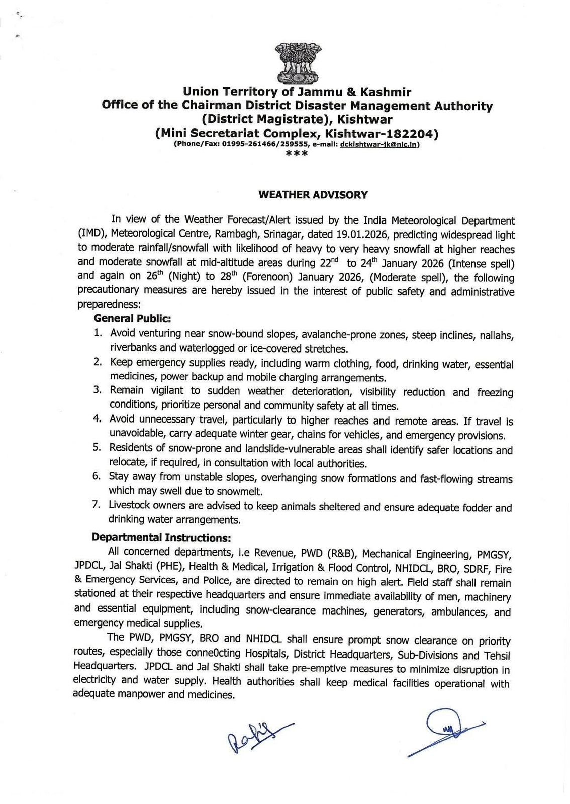 The advisory has been issued by Pankaj Kumar Sharma, JKAS, District Magistrate and Chairman, District Disaster Management Authority (DDMA), Kishtwar, dated January 19, 2026.