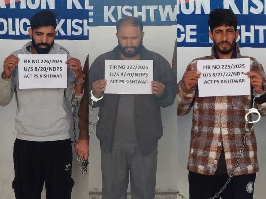 Jammu, Nov 07, 2025 – In a strong move against narcotics, Kishtwar Police has stepped up its anti-drug campaign, resulting in the arrest of three drug peddlers over the past three days. During the operations, officers recovered 7.5 grams of heroin, 70 grams of charas, 32 psychotropic capsules (Pyeevon Spas Plus), and ₹7,500 in cash.