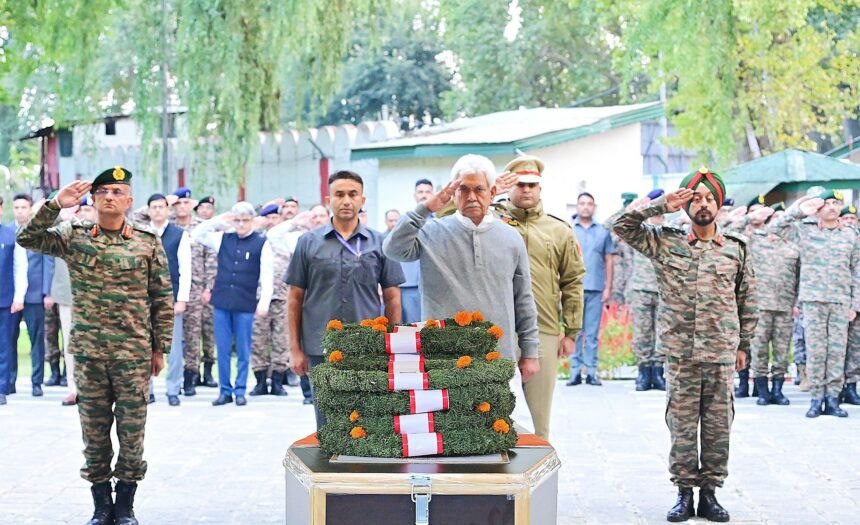 Jammu and Kashmir Lieutenant Governor Manoj Sinha on Saturday laid a wreath and honored two Army soldiers, Lance Havildar Palash Ghosh and Lance Naik Sujay Ghosh.