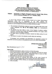 During the Suspension of the Yatra, the movement of pilgrims (Shardhaalus) towards the Machail Mata Shrine will remain suspended from October 5th to October 7th, 2025 beside no pilgrim will be permitted to proceed towards the shrine during the suspension period.