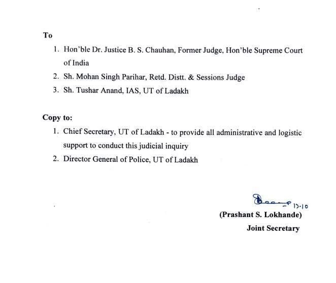 The order, the copy of which is available with News Insider 24X7 is signed by Prashant S. Lokhande, Joint Secretary, also directs the Chief Secretary, UT of Ladakh, and the Director General of Police, UT of Ladakh, to provide all necessary administrative and logistic support to facilitate the judicial inquiry.