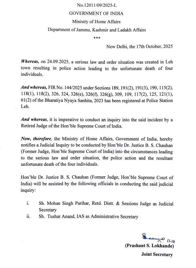 Jammu, October 17, 2025: In a significant move to address escalating tensions in the Union Territory of Ladakh, the Ministry of Home Affairs (MHA), Government of India, has ordered a Judicial Inquiry into the serious law and order incident that occurred in Leh town on September 24, 2025, which tragically resulted in the deaths of four individuals.