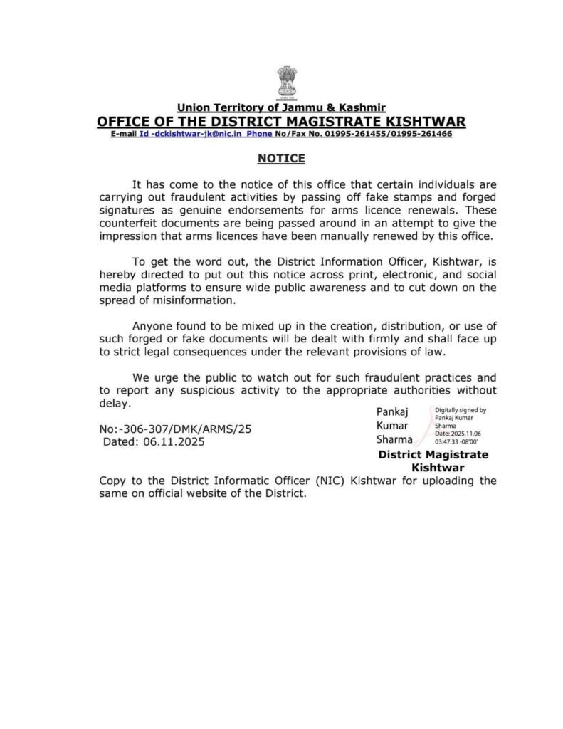 Jammu Nov 6, 2025: The District Magistrate of Kishtwar has issued an urgent public notice warning citizens about a fraudulent scheme involving fake renewals of arms licenses. The alert, released on Thursday (November 6), cautions that certain individuals are engaged in forging official stamps and signatures to produce counterfeit endorsements appearing to be issued by the District Magistrate’s office.