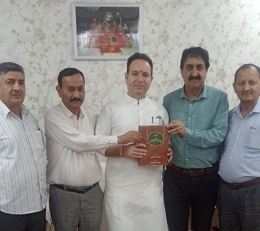 Jammu, March 11: Leader of Opposition in the J&K Legislative Assembly and MLA from Padder–Nagseni, Sunil Sharma, was presented a copy of Kulliyat-e-Janbaz, a comprehensive collection of poems by noted Kishtwar poet Ghulam Nabi Doolwal, popularly known by his poetic name Janbaz, at his residence in Jammu.